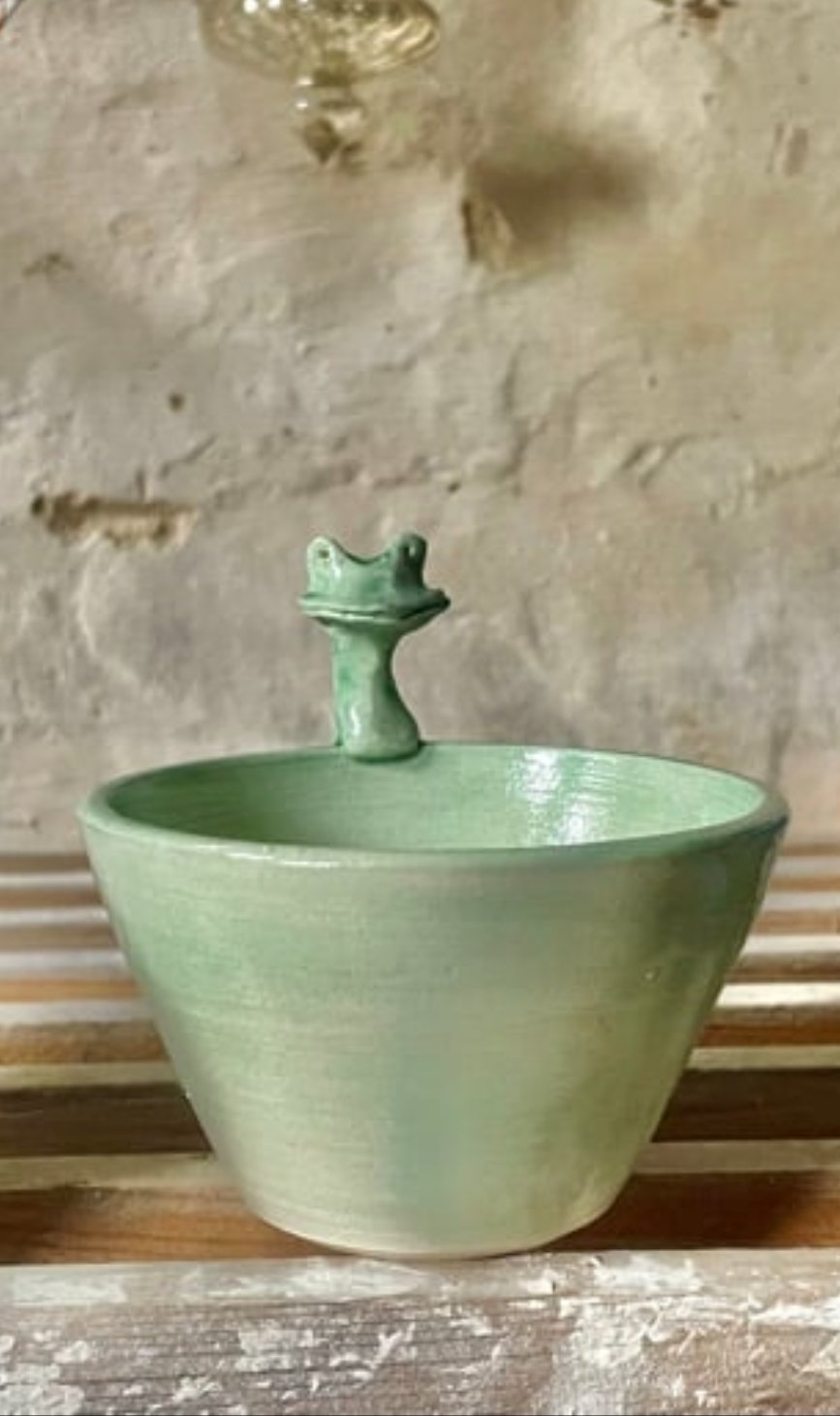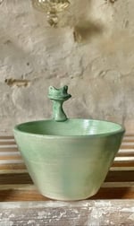This small wheel thrown bowl features a hand-modelled frog to watch over whatever you choose to keep in it. Adorable as a children’s present, a grown-up gift, or anything in between. Perfect as a coffee cup, a dipping bowl, for salt, jewellery — or whatever you fancy.