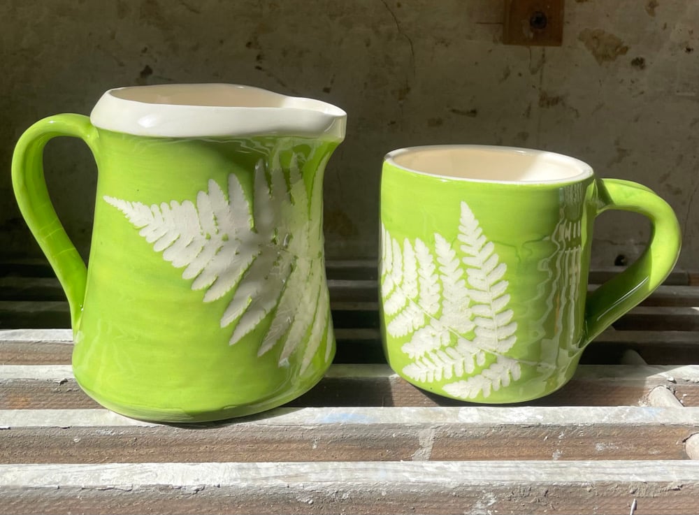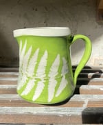 This wheel thrown jug is decorated with a Sussex fern and is in a beautiful vibrant verdant green. Great for milk or gravy or sauce or with a small bunch of flowers in it.