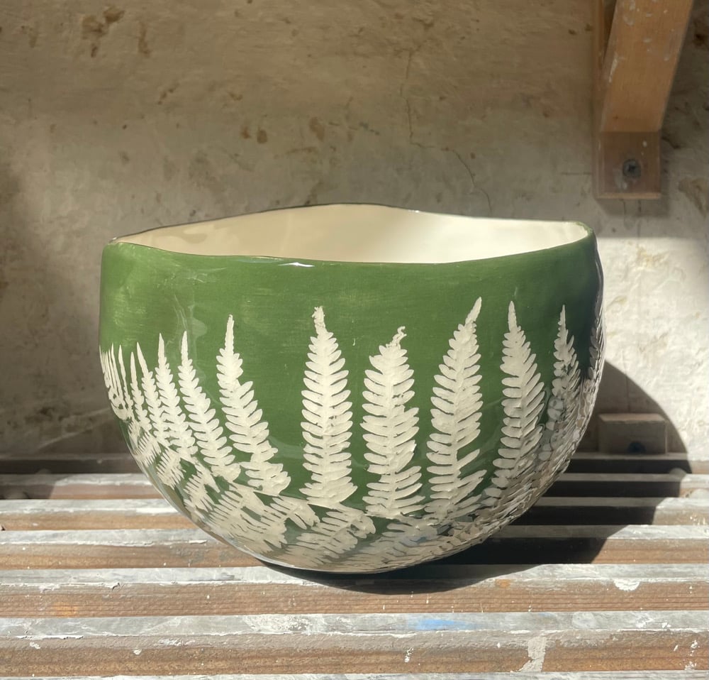 This charming medium planter is carefully handcrafted from a single ball of clay, featuring a delicate leaf impression from the ancient woodlands of Sussex. It is coloured with copper oxide. Whether holding a plant or displayed as a standalone piece, its natural beauty will bring a touch of the outdoors into your home.